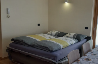 1 slaapkamer met een dubbel bed. Living met dubbel sofabed. Appartment met douche, wc, TV.